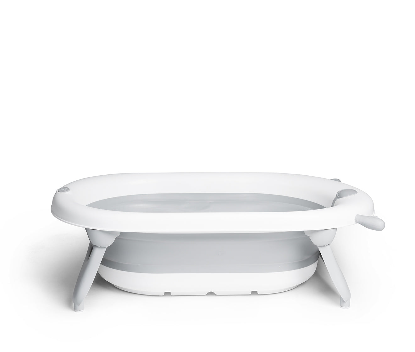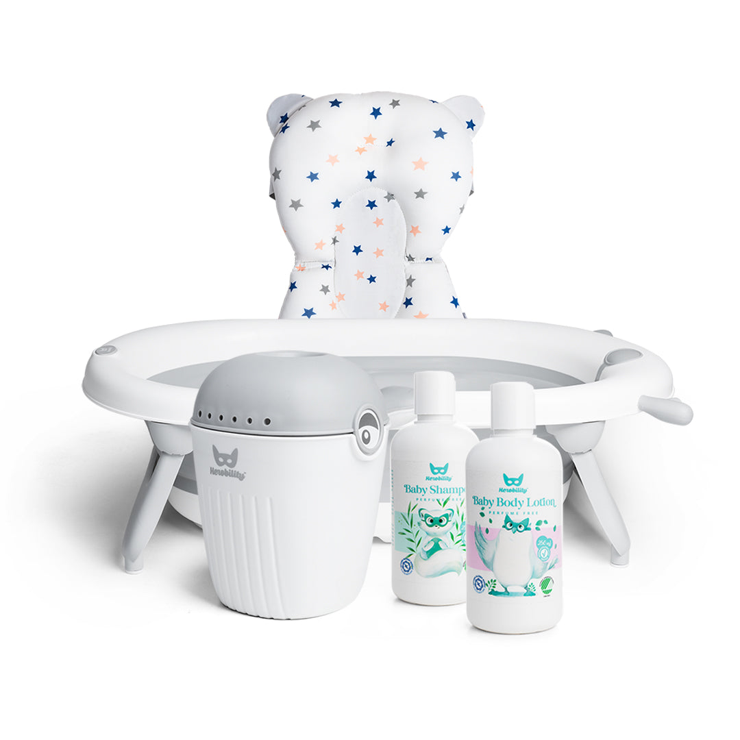 The foldable bathtub with heat-sensitive plug saves space and adds extra safety during bath time. The soft bath cushion with adjustable straps provides comfort and stability.